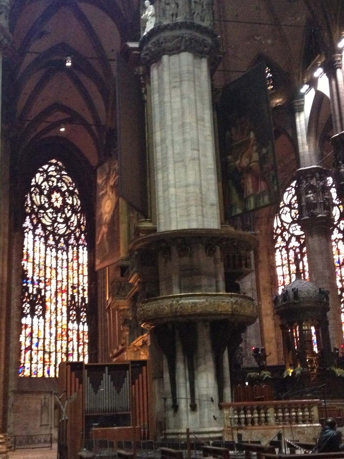 When getting off the train from Torino to Milan, I was greeted by a truly magnificent train station. The area that our train arrived in was a large dome-like area made of steel and glass. Walking the length of our train we came to the main area of the station. There were flashy adds for clothing and airfare and a Guess store prompted the entrance to a shopping area. We walked through beautiful old train station buildings and down to their metro station into a jam-packed metro to Milan's famous Duomo.